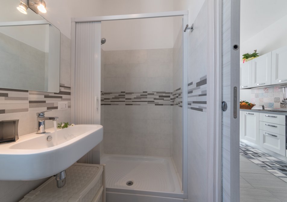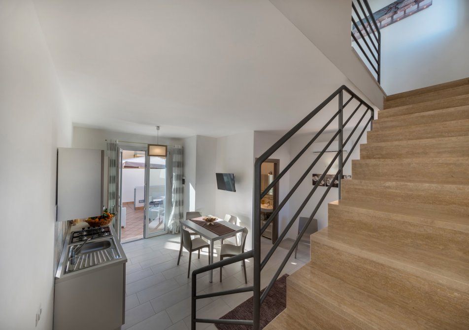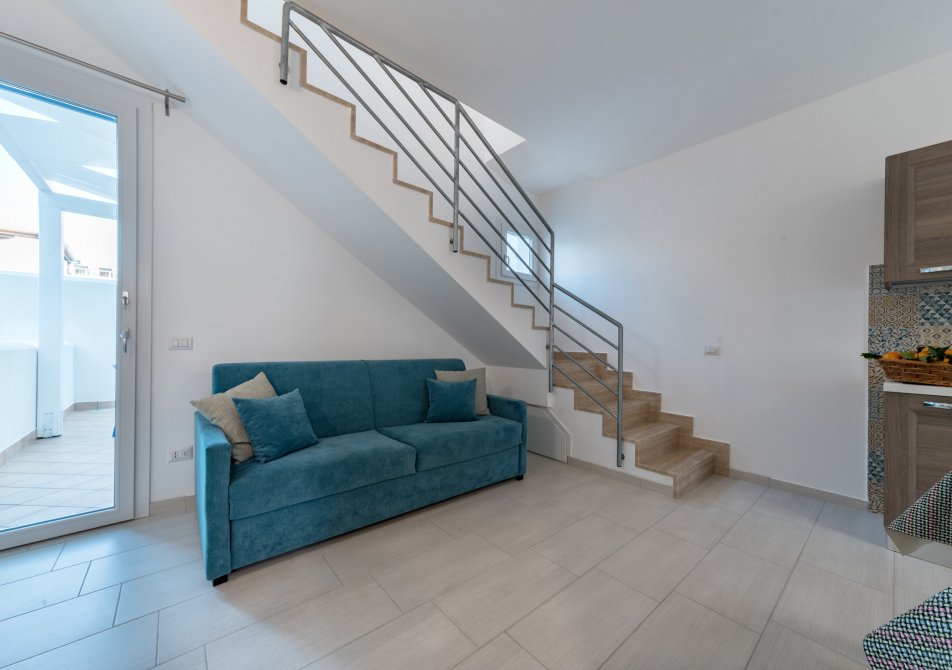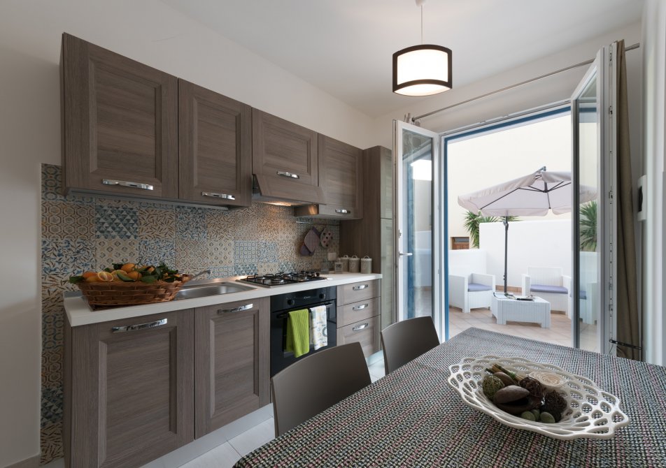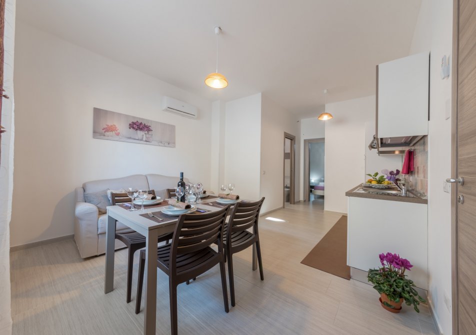 Mini appartamenti bilocali al piano terra, dotati di spazi esterni di pertinenza: veranda attrezzata con ombrellone, tavolo e sedie. All’interno cucina-soggiorno con divano letto e ampia camera da letto matrimoniale, con bagno con doccia.